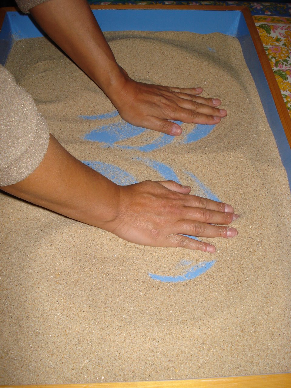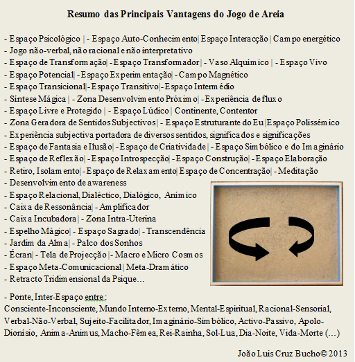 "O contato com a areia traz sentimentos profundos e possibilita a ligação com o inconsciente. Através do movimento na areia, revivem-se memórias guardadas, onde a energia psíquica começa a se movimentar e é libertada, provocando uma emoção. Assim, a aproximação às imagens feitas na areia dá-se, não pela palavra, mas por outras formas não verbais como as corporais, as sensações e os sentimentos".