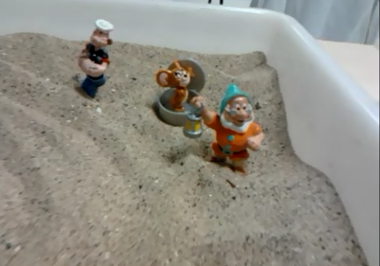 As miniaturas incluem representações de animais selvagens e domésticos, carros, comboios e outros meios de transporte, igrejas, casas, figuras humanas, religiosas, em resumo diversos objetos simbólicos tanto do nosso mundo real como imaginário, permitindo um contacto directo, tridimendisional da realidade e da fantasia, facilitando a criação de cenários, a representação e dramatização de histórios. Os objectos ganham vida própria transcendem-se e dão vida própria à imagem construida e criada. O jogo de areia representa assim o espelho da alma, espaços de criatividade e imaginação (...).